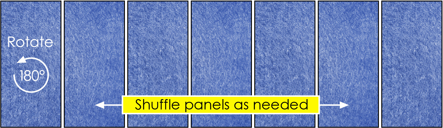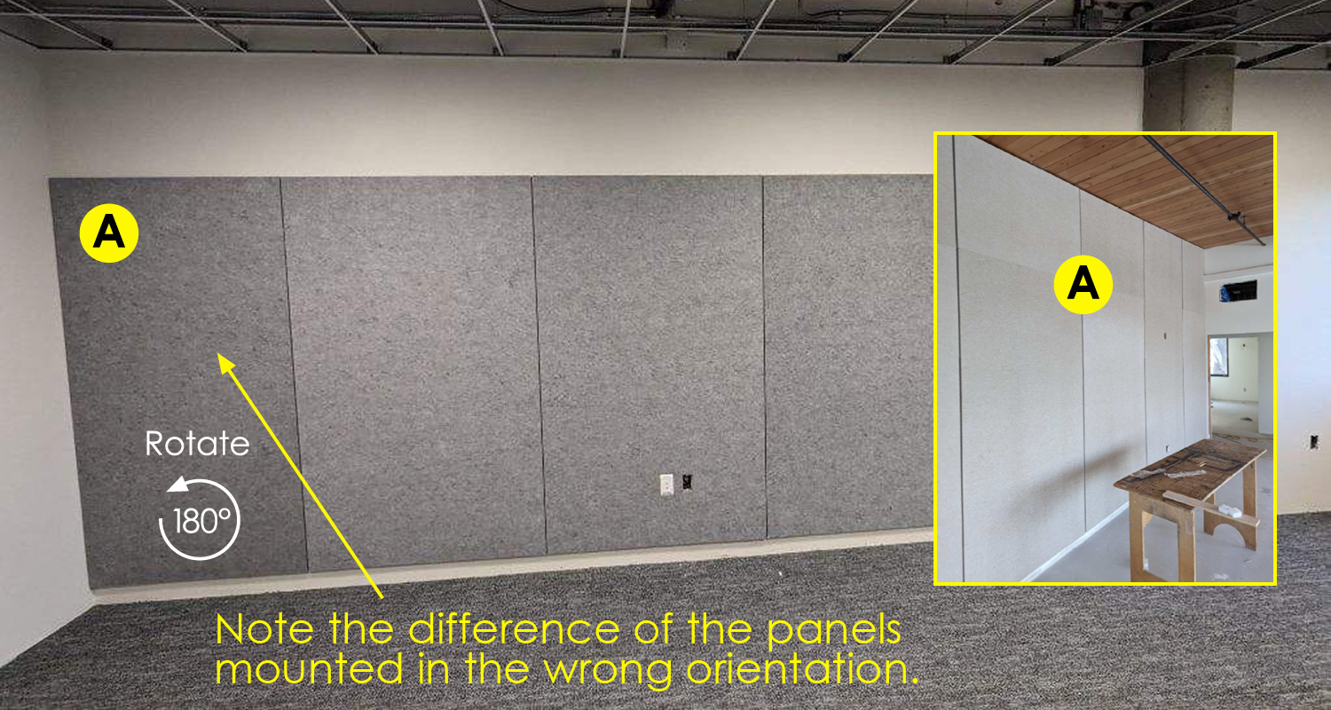 If panels are not installed as recommended, they may have a different look even though the color is correct. This is because the fibers are directional. If the panels are not installed correctly, the hue will look different as seen on image A and correctly on panels in image B.
